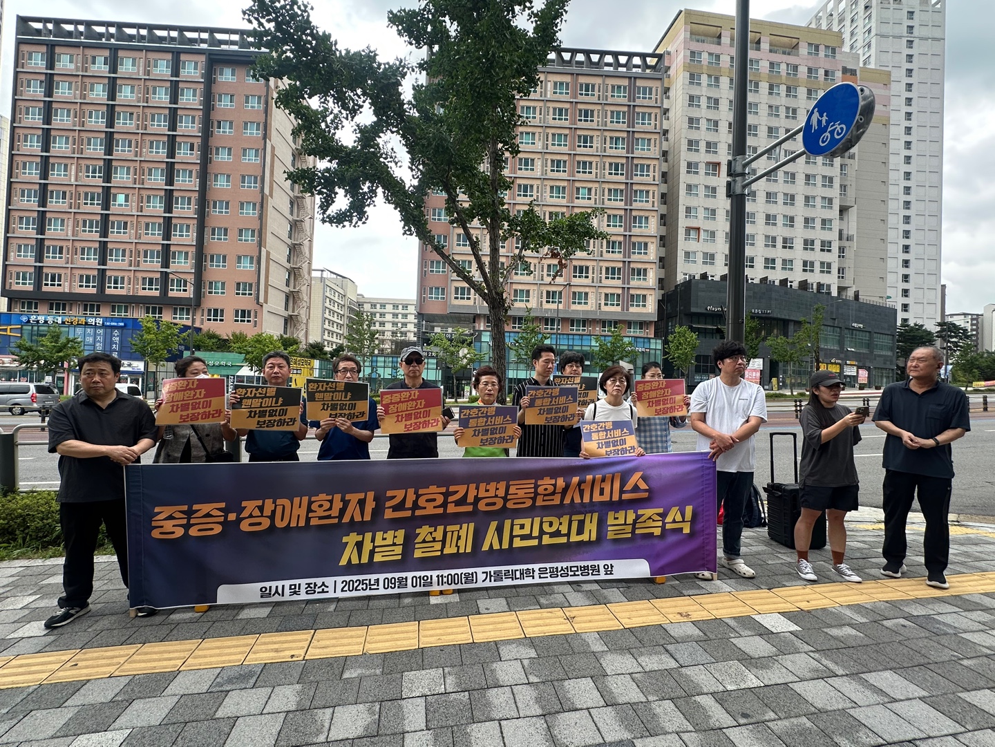 2025년 9월 1일, 은평성모병원 앞에서 ‘중증·장애환자 간호간병통합서비스 차별철폐를 위한 시민연대’가 공식 출범하며 기자회견을 열었습니다. 이번 연대는 중증·장애 환자들이 정당하게 보장받아야 할 간호간병통합서비스 이용을 의료기관이 거부하는 현실에 문제의식을 갖고, 환자의 생명과 안전을 지키며 의료 불평등을 바로잡기 위해 구성되었습니다.